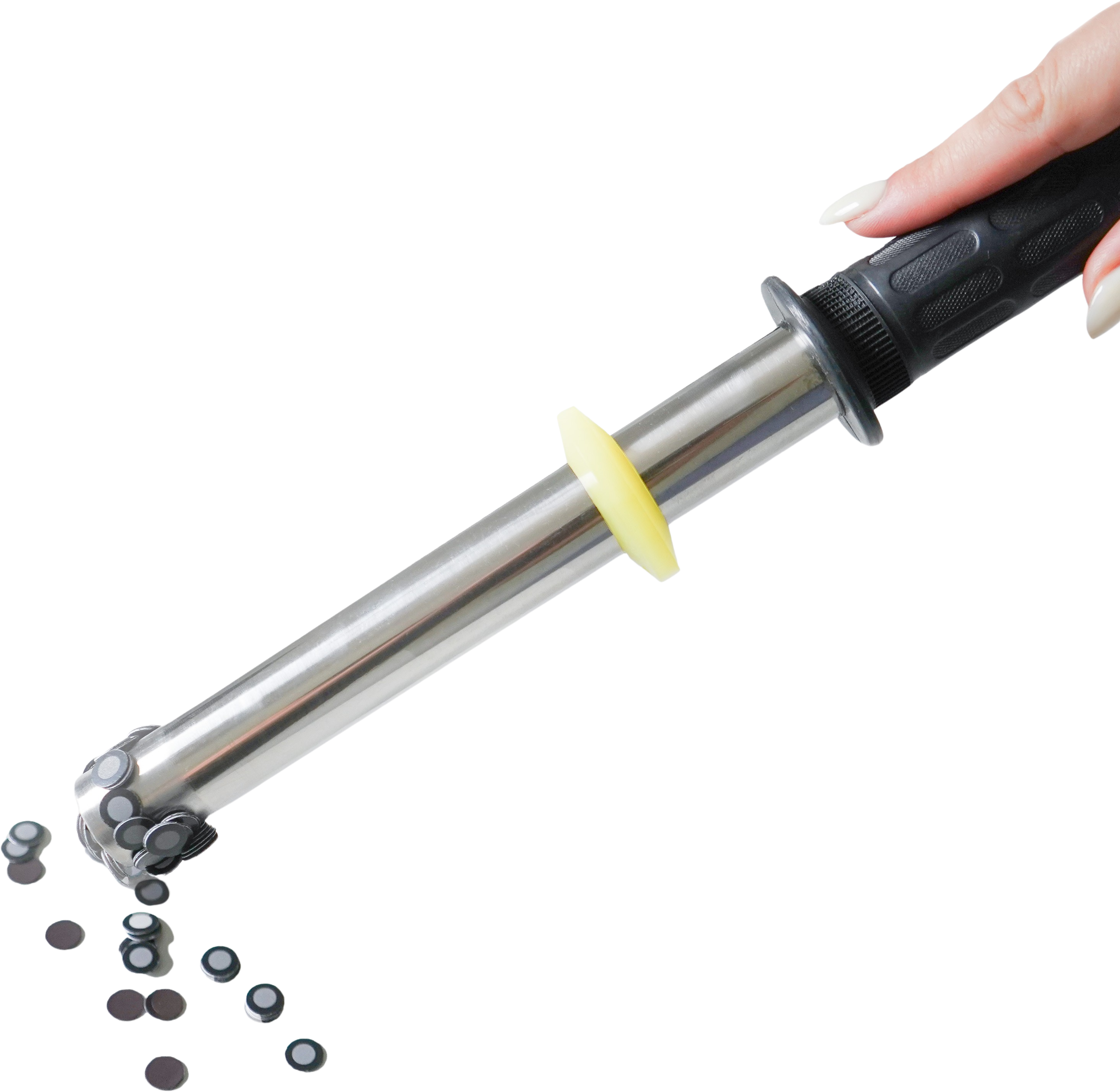 Magnetna palica za konfete AESUBdots je praktično orodje za hitro zbiranje kovinskih referenčnih pik po 3D-skeniranju. Magnetna palica je sestavljena iz cevi iz nerjavečega jekla, dolžine približno 35 cm, s premerom 2,5 cm in ima v notranjosti močno magnetno jedro.