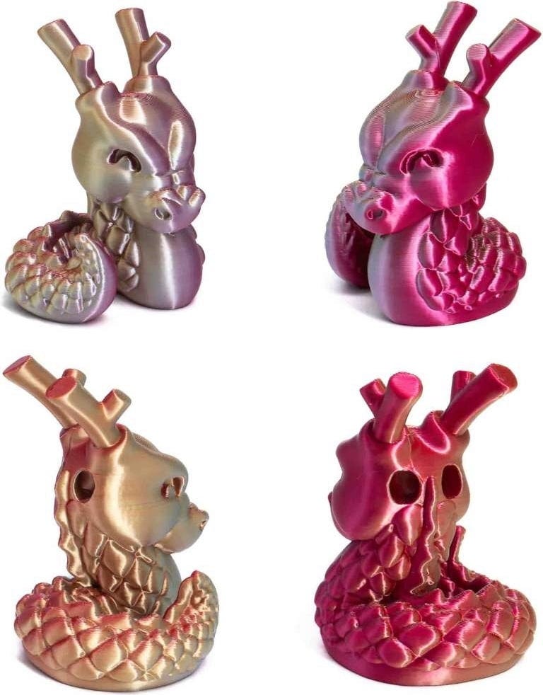 Zahvaljujoč najsodobnejši tehnologiji koekstruzije, PLA Silk Multicolor združuje dve ali celo tri barve v enem samem filamentu. To ustvarja tekoče barvne prehode in edinstvene učinke sijaja, ki se spreminjajo glede na kot gledanja. Tako je vsaka tiskovina edinstven, pa naj gre za vaze, figurice, nakit ali dekorativne dodatke za dom.