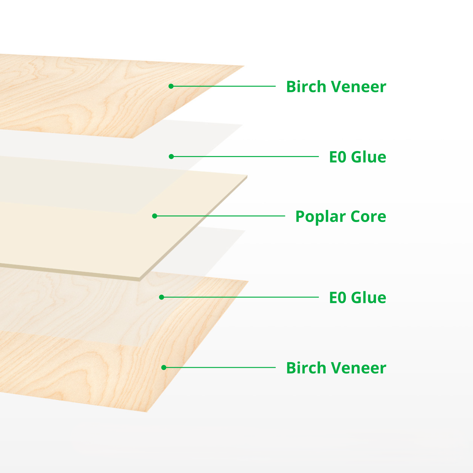 Bambu Lab Birch Plywood navdušuje s svojo fino, lahko površino in naravnimi vzorci. Zaradi tega je idealna izbira za vse, od dekorativne do funkcionalne uporabe – od stenskih umetnin in napisov do škatel za shranjevanje, polic in pisarniških organizatorjev. Vezan les iz breze je odlična za barvanje ali lakiranje, zato je kot nalašč za projekte, ki zahtevajo vaš edinstven pridih. In ker je za jedro uporabljen samo vrhunski topol (namesto mešanega lesa), imate koristi od enakomerne gostote vlaken, manj ostankov ožganin med laserskim rezanjem in popolnoma čistega zaključka.