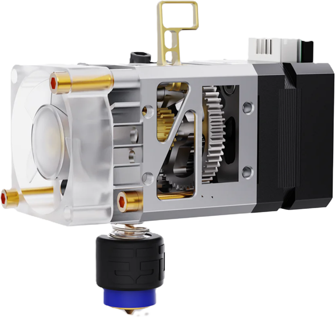 Z prestavnim razmerjem 7:1 in maks. ekstruzijsko silo 7,5 kg na dvojnih zobnikih z nanoprevleko je doseženo izjemno gladko podajanje filamenta. Pritisk, ki ga zobniki izvajajo na filament, je mogoče prilagoditi po vaših željah za večjo fleksibilnost, kar je še posebej uporabno pri tiskanju s fleksibilnimi filamenti, kot je TPU.