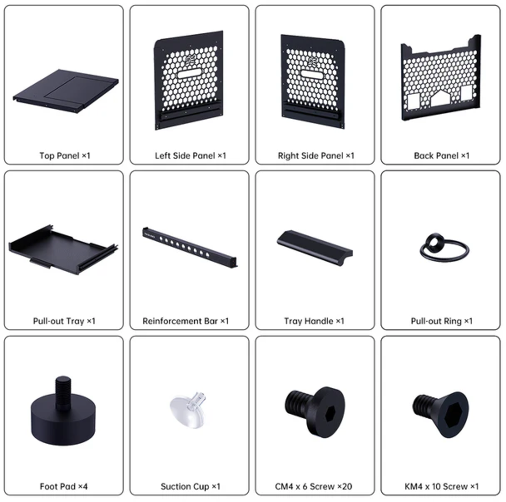 ► Spodnja raven: Optimalno zasnovana za AMS, z neposrednim dostopom do filamentov in dovolj prostora za nemoteno menjavo materiala. To spremeni kaos kablov in opreme v urejeno in učinkovito delovno mesto.