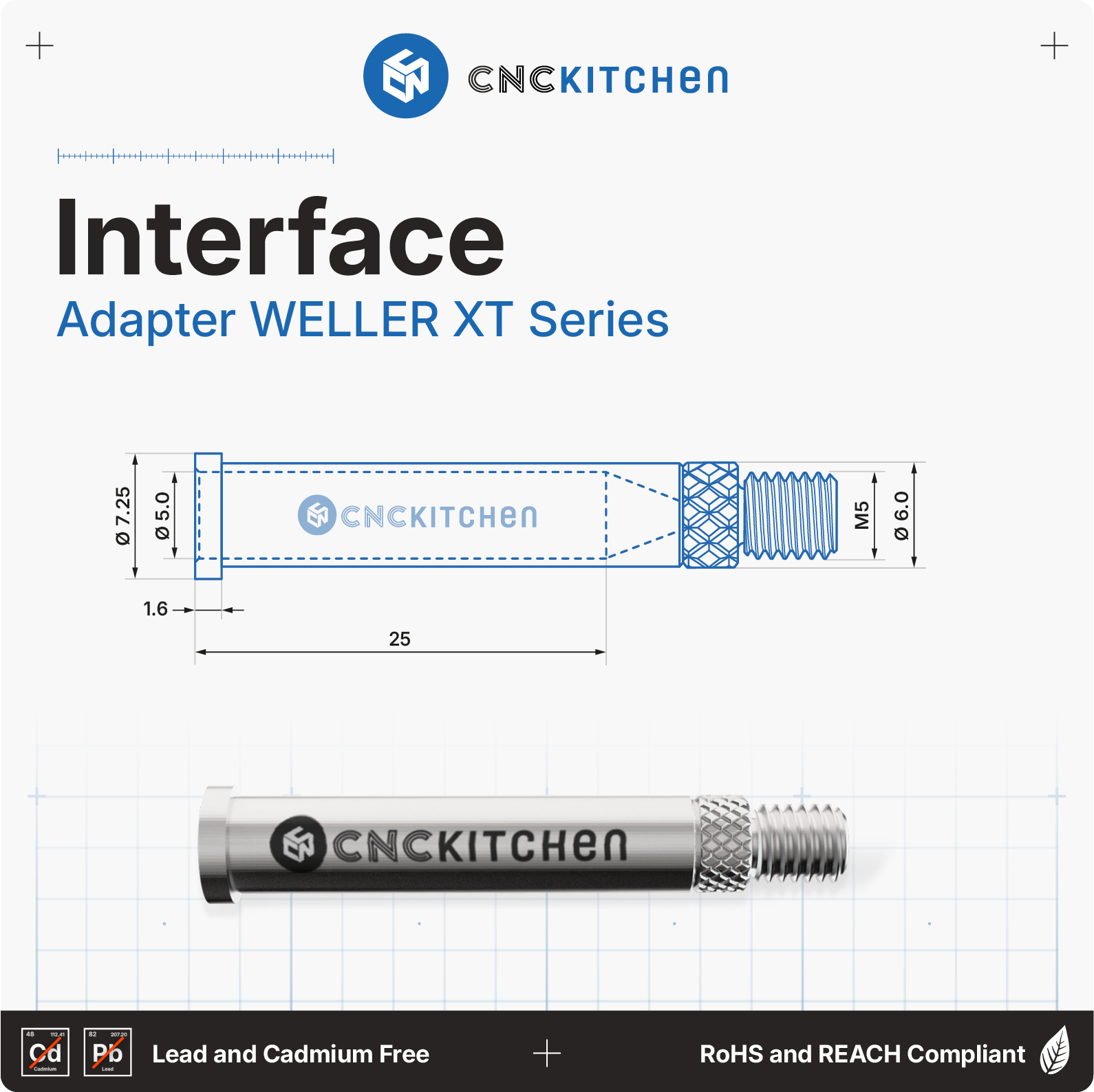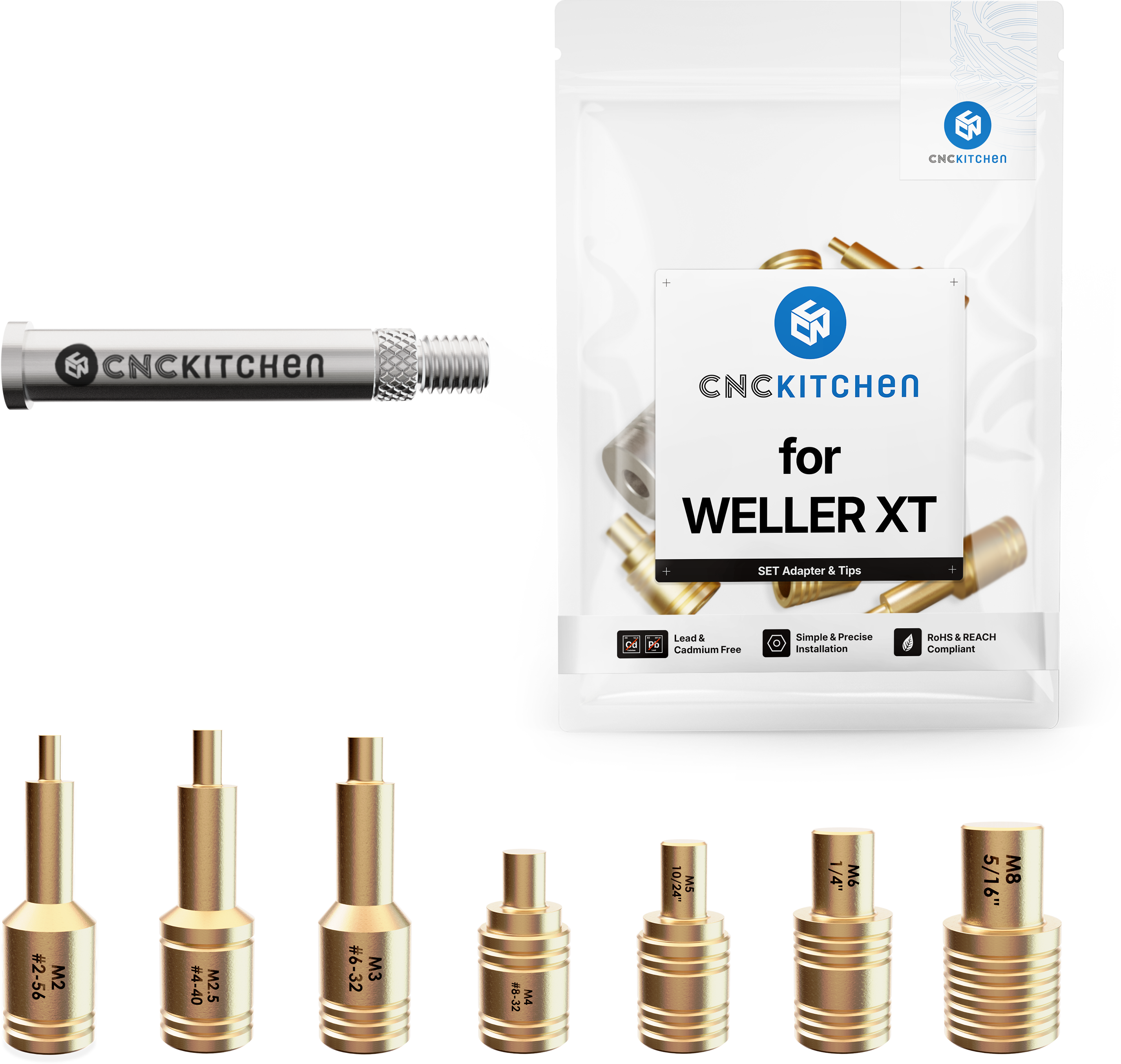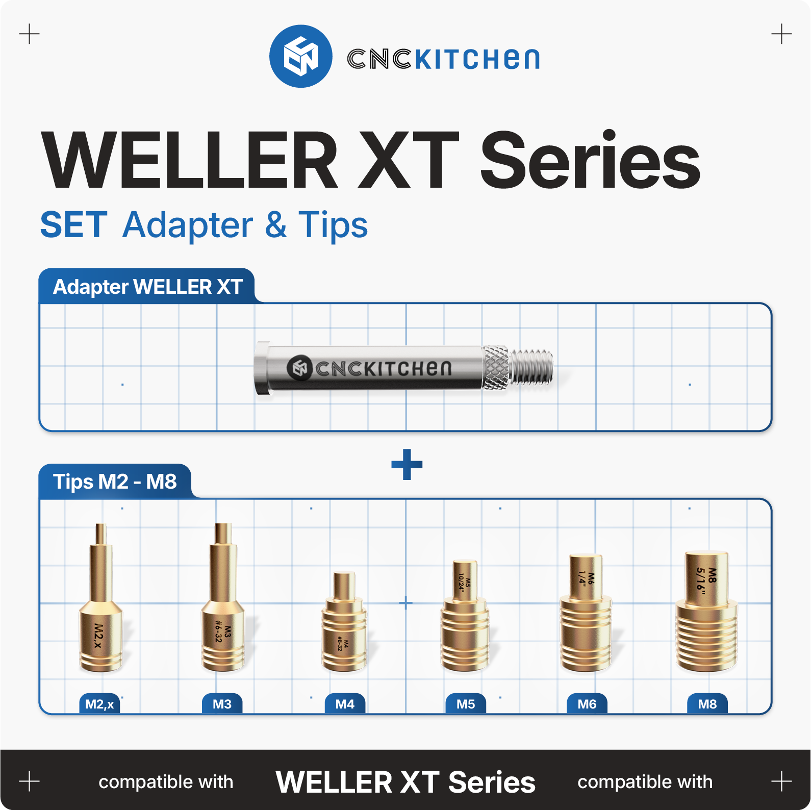 Spajkalne konice so združljive s spajkalniki Weller XT in se popolnoma ujemajo z navojnimi vložki znamke CNC Kitchen. Imajo laserske oznake in zareze za enostavno prepoznavanje velikosti.