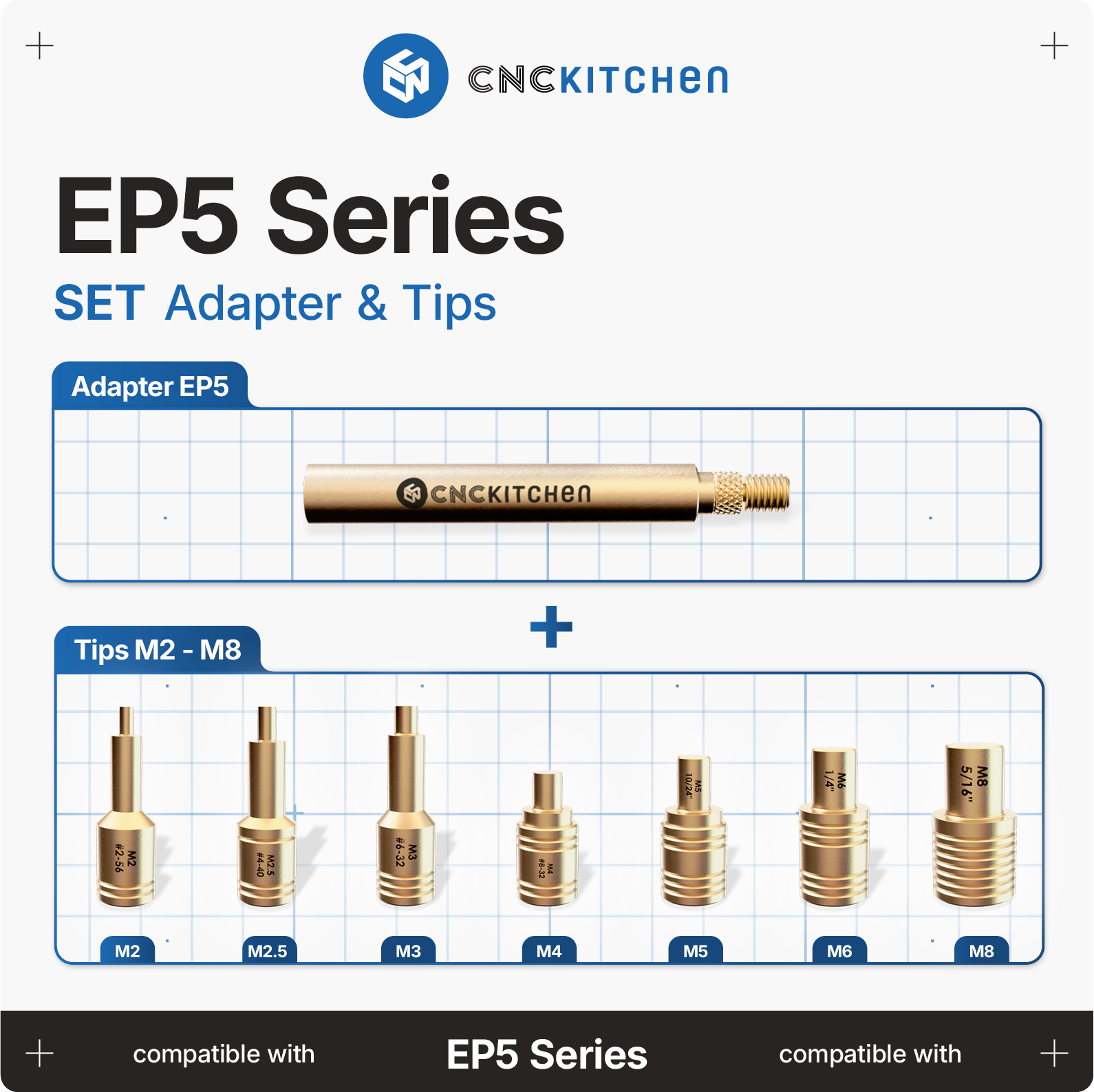Spajkalne konice so kompatibilne s standardnimi spajkalniki EP5 in se popolnoma ujemajo z navojnimi vložki CNC Kitchen. Imajo laserske oznake in zareze za enostavno prepoznavanje velikosti. Skladno z REACH.