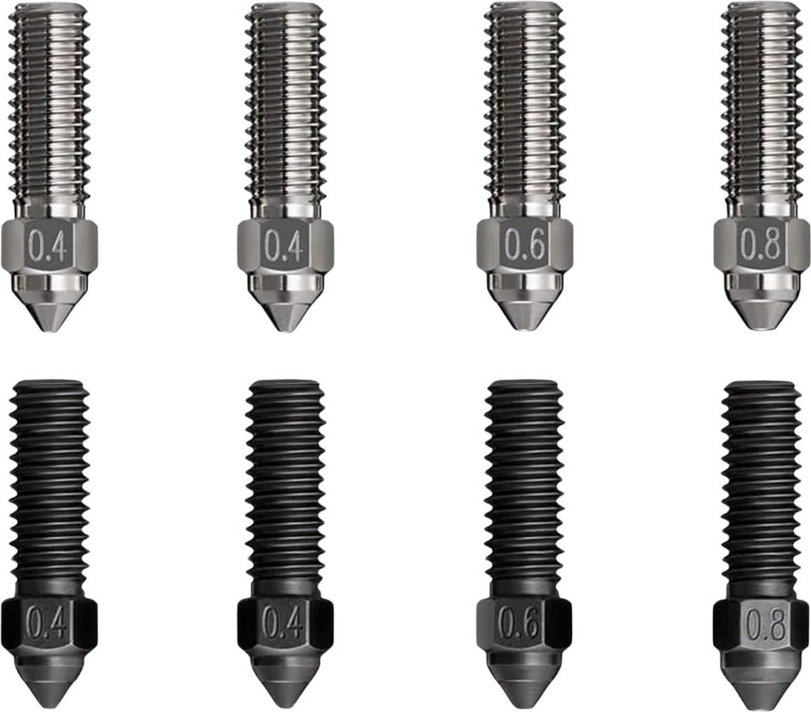 | Kompatibilnost s filamenti | PLA, ABS, PETG, TPE, TPU, PC, PEEK, PEI, PSU, PPSU kot tudi drugi visokotemperaturni materiali | PLA, ABS, PETG, TPE, TPU, PC, kompozitni materiali z abrazivnimi dodatki (npr. ogljikova vlakna, steklena vlakna, jeklo, les, borov karbid, Wolfram itd.) |