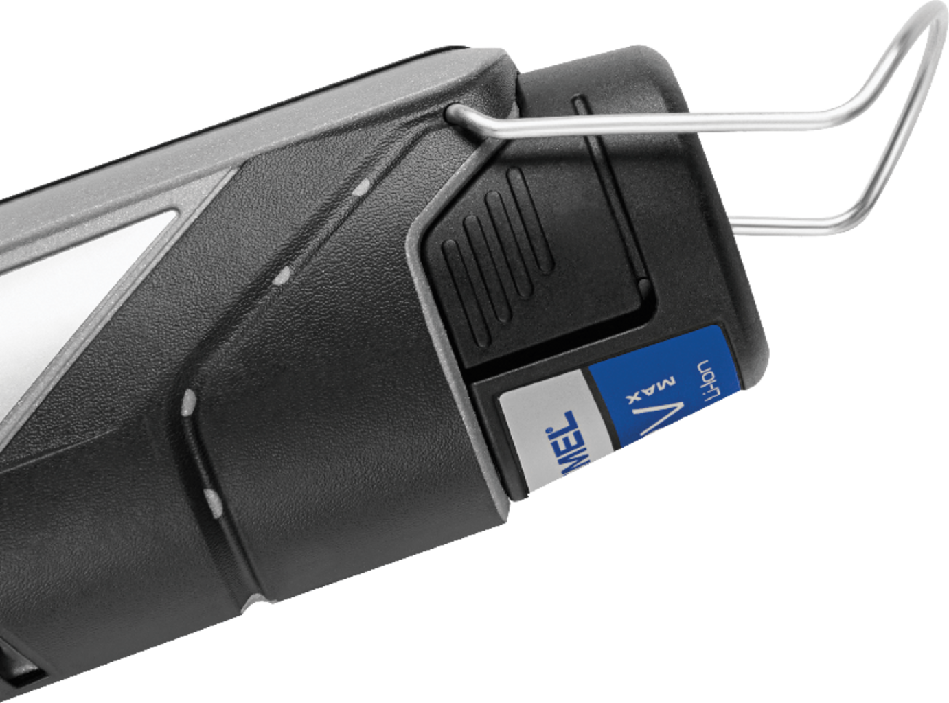 Zahvaljujoč ergonomski zasnovi se orodje udobno prilega roki in ponuja optimalno rokovanje. Gumiran ročaj z mehkim oprijemom zagotavlja varen oprijem in zmanjšuje vibracije. Opremljen z zanko za obešanje, fleksibilna gred omogoča, da napravo obesite na držalo orodja Dremel. Ima informativen LED indikator napolnjenosti baterije.