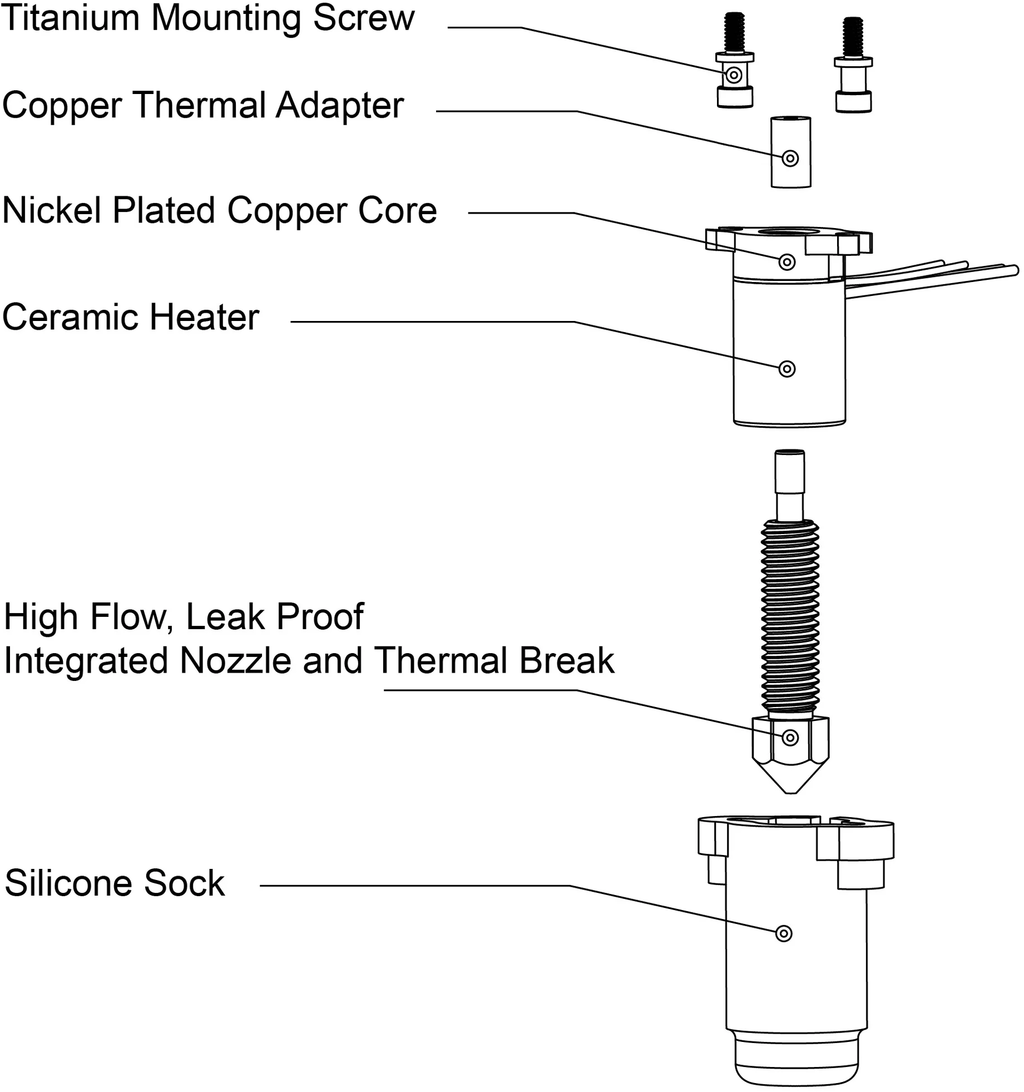 FlowTech hotend je sestavljen iz trajno zatesnjenega sklopa, ki ga sestavljata šoba in toplotni most. Ta neprepustna zasnova zagotavlja, da se zaradi puščajoče šobe ne uniči tisk ali zapravi material.