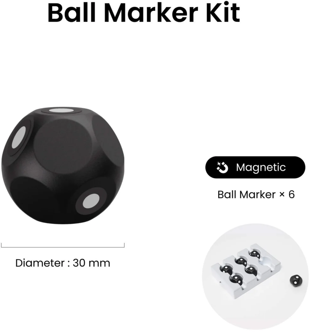 Ball Marker Kit znamke Revopoint je vaš zanesljiv pomočnik za natančnejše in učinkovitejše 3D-skeniranje. Pametni Ball markerji hitro zagotovijo več referenčnih točk iz različnih kotov ter tako ne le optimizirajo vaš delovni proces, temveč omogočajo tudi izboljšano natančnost sledenja markerjem in natančno poravnavo.
