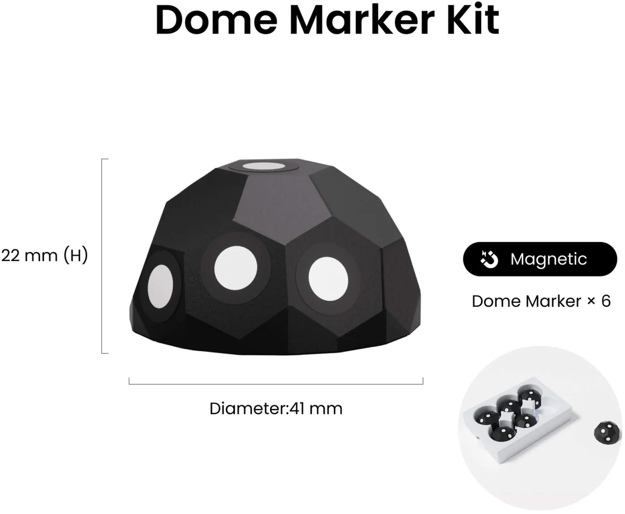 Dome Marker Kit znamke Revopoint je vaš zanesljiv pomočnik za natančnejše in učinkovitejše 3D-skeniranje. Pametni Dome markerji hitro zagotovijo več referenčnih točk iz različnih kotov ter tako ne le optimizirajo vaš delovni proces, temveč omogočajo tudi izboljšano natančnost sledenja markerjem in natančno poravnavo.