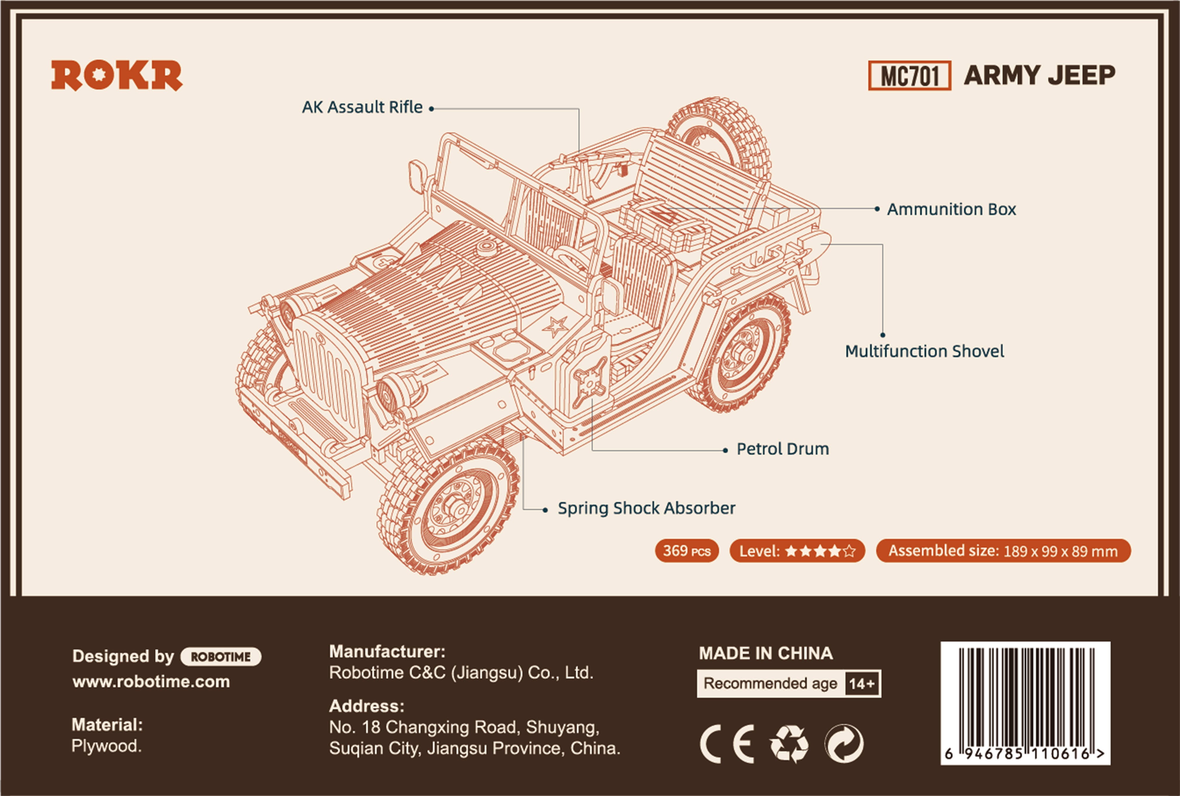 Pametno sestavljeno brez lepila: Army Field Car je izdelan iz lasersko rezane vezane plošče, ki je lepo obdelana, gladka in prijetna na dotik. Vsi deli so predhodno izrezani in ne potrebujejo nobenega lepila. Namesto tega domiselni vtični spoji in mehanizmi za zatikanja zagotavljajo stabilnost in presenetljivo domiselno zasnovo.