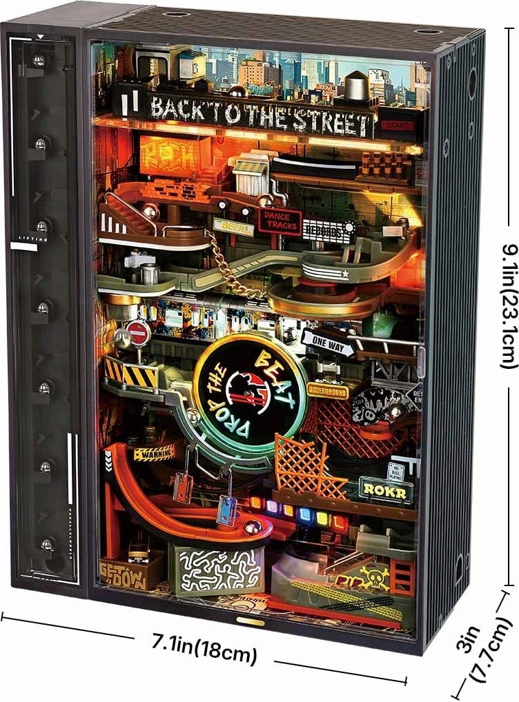 Dobrodošli na ROKR Hip-Hop Street! Tukaj se kroglice ne kotalijo le po stezah – gibajo se v ritmu mesta. Grafiti na stenah, zlate verige v zasnovi, vrteča se plošča v središču in skate park, ki je videti, kot da ga je nekdo pravkar poškropil z neonsko barvo. Ta 3D lesena sestavljanka je urbano igrišče, ki ga navdihujejo ulična kultura, glasba in gibanje.