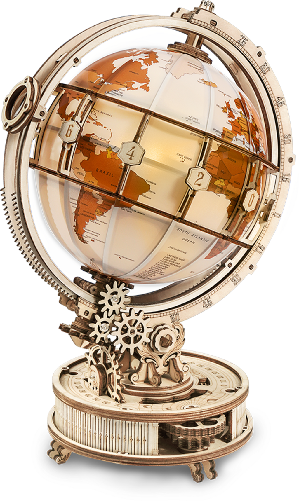 Mehanično potovanje: V podstavku je mehanizem, ki ga poganja zobniški pogon, ki omogoča gladko vrtenje globusa. Brez skrite tehnologije, le mehanika, ki jo je mogoče videti in razumeti.