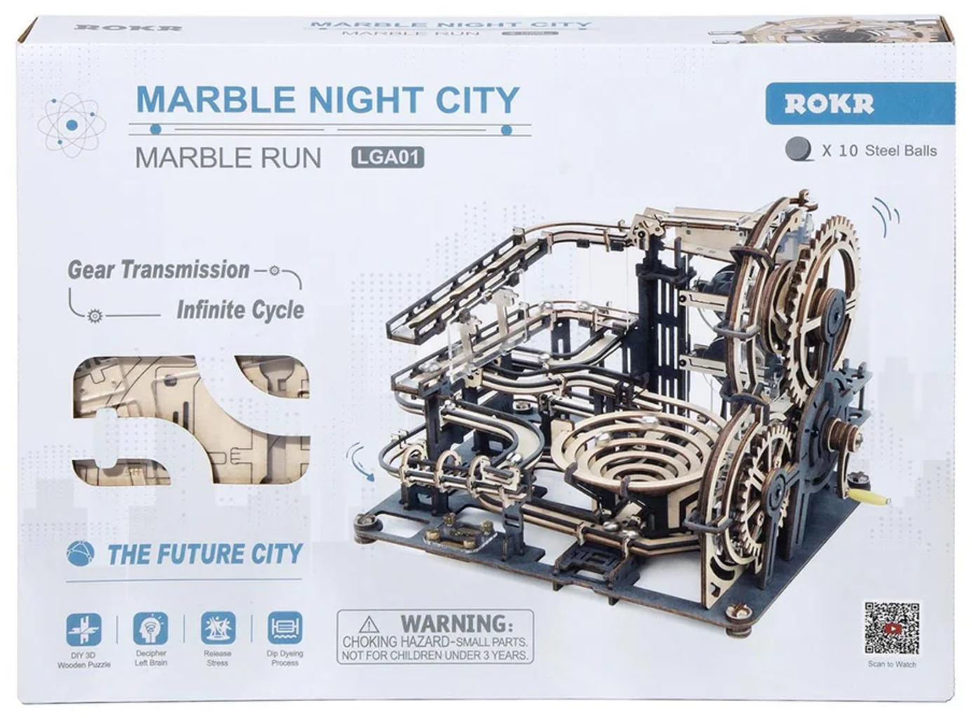 Dobrodošli v futuristični metropoli iz lesa, zobnikov in jeklenih kroglic. ROKR Marble Night City je več kot le 3D lesena sestavljanka – to je majhno, mehansko nočno mesto, kjer frnikole švigajo po večnivojskih tirnicah, zavijajo, se vzpenjajo po dvigalih in drsijo skozi spretno zgrajen labirint.