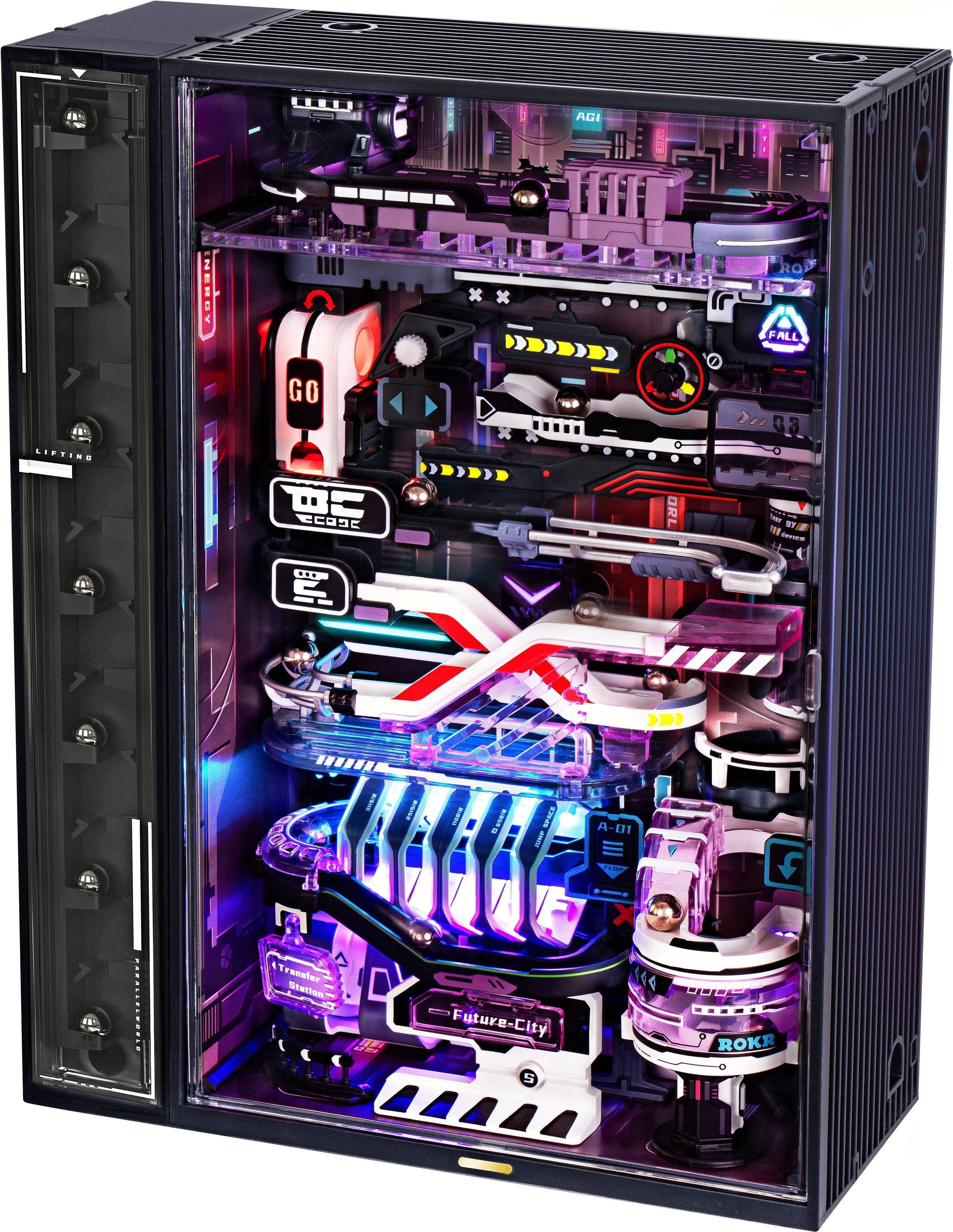 Potovanje skozi prihodnost: Kroglice potujejo po 174 cm dolgi progi in prečkajo več futurističnih prizorov. Navpične in vodoravne ravni ustvarjajo dinamiko, prozorni elementi pa omogočajo vidljivost vsakega giba. Prihodnost se zdi kot zamrznjen trenutek iz kibernetskega sveta – živahna, gosta in polna podrobnosti.