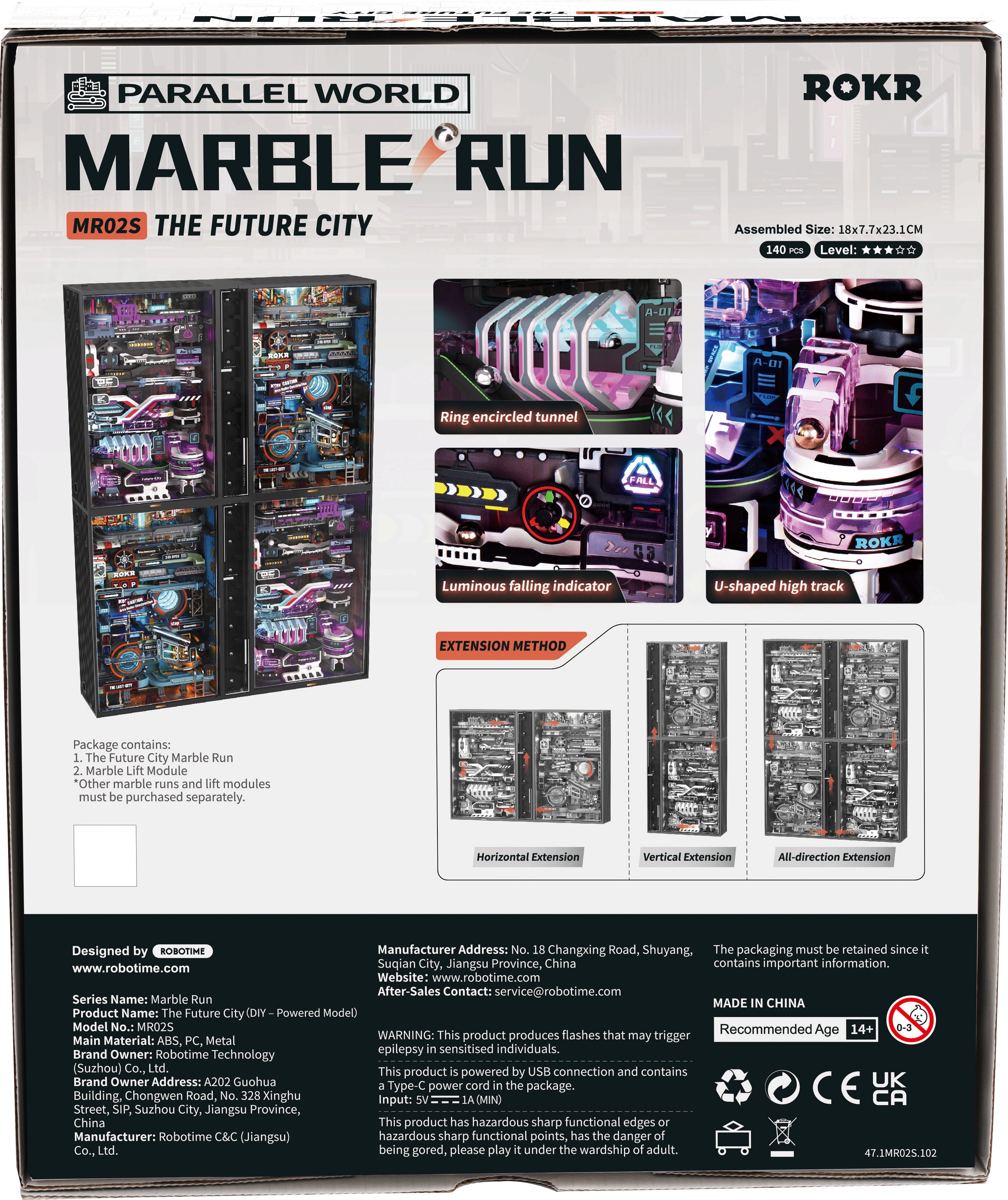Vaše lastno vesolje: The Future City je prosto razširljivo in združljivo z drugimi plastičnimi progami za kroglice znamke ROKR iz iste serije. Dodatna območja je mogoče povezati vertikalno in horizontalno z dvigalnimi moduli. Na ta način postopoma nastane večje kibernetsko vesolje.