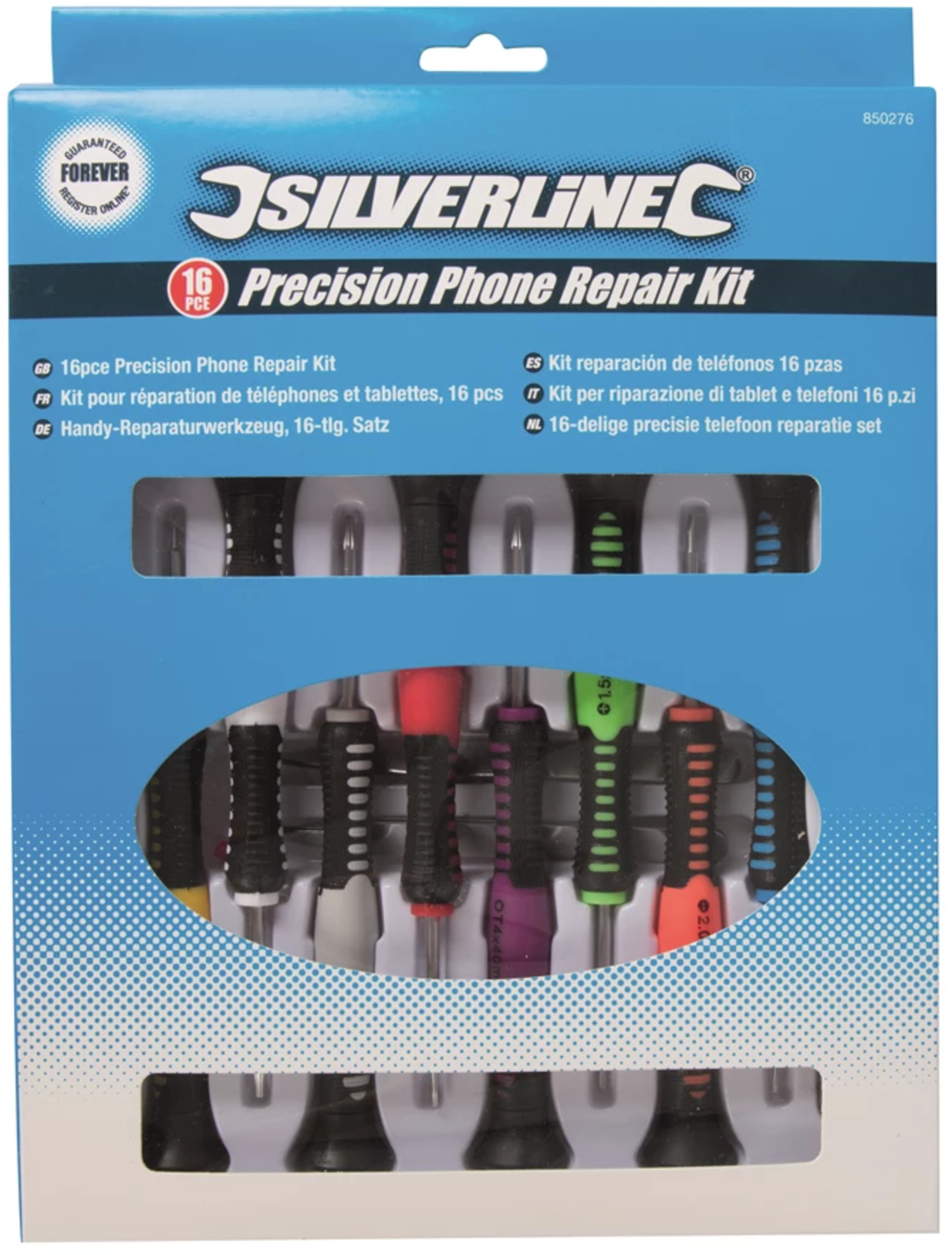 To orodje za popravilo mobilnih telefonov znamke Silverline je sestavljeno iz 16 natančnih jeklenih orodij, ki se uporabljajo za popravilo mobilnih telefonov ter tabličnih in prenosnih računalnikov.