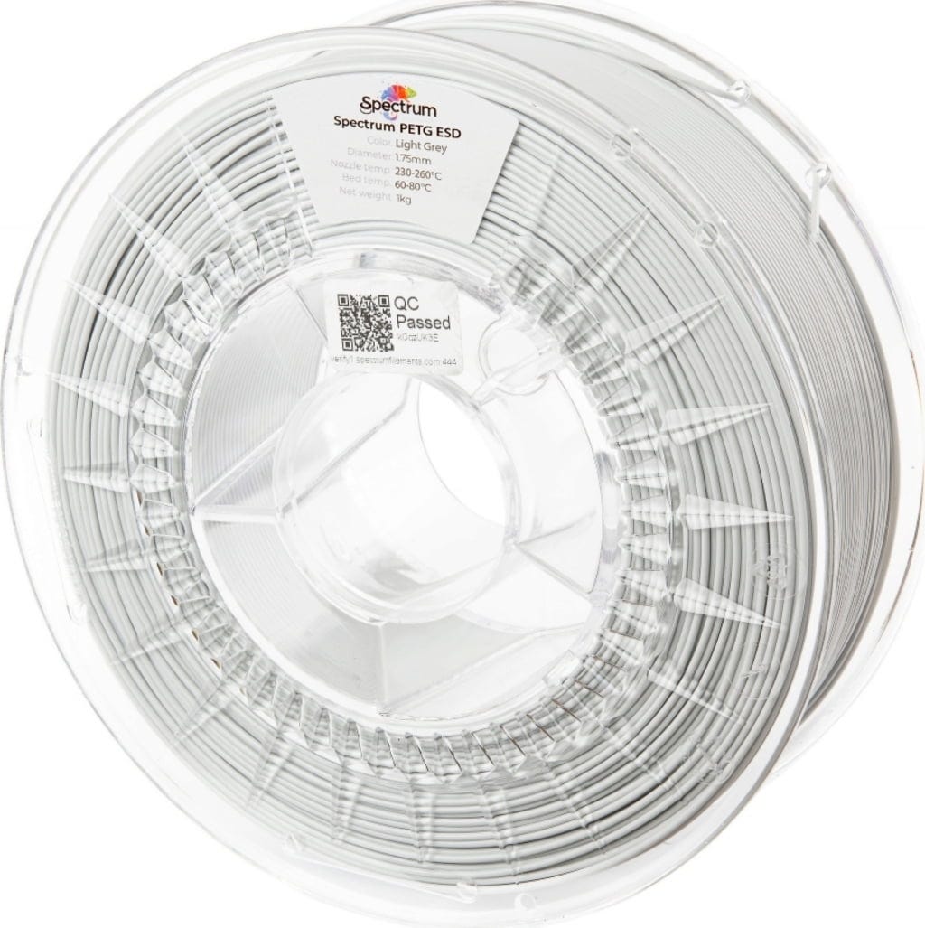 Spectrum PETG ESD je profesionalni antistatični filament, posebej zasnovan za okolja, kjer elektrostatična razelektritev predstavlja resnično nevarnost. Zahvaljujoč posebej razviti, trajno učinkoviti ESD formulaciji material združuje robustnost in enostavno tiskanje PETG-ja z zanesljivo zaščito za elektroniko, merilne instrumente in EX/ATEX cone. Mat površina zagotavlja visokokakovosten, tehnični zaključek, zaradi česar je idealen za profesionalno uporabo in precizne funkcionalne komponente.