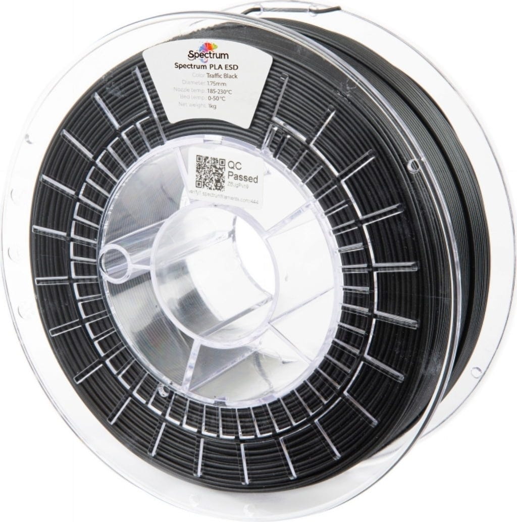 Spectrum PLA ESD je specializiran, antistatični PLA filament, razvit za uporabo, kjer so elektrostatična varnost, natančnost tiskanja in enostavnost uporabe najpomembnejši. Kot modificiran PLA biopolimer združuje enostavno obdelavo klasičnih PLA materialov s trajno ESD zaščito, zaradi česar je idealen za uporabo v občutljivih elektronskih okoljih in na območjih EX/ATEX, jer se je treba za vsako ceno izogniti iskrenju.