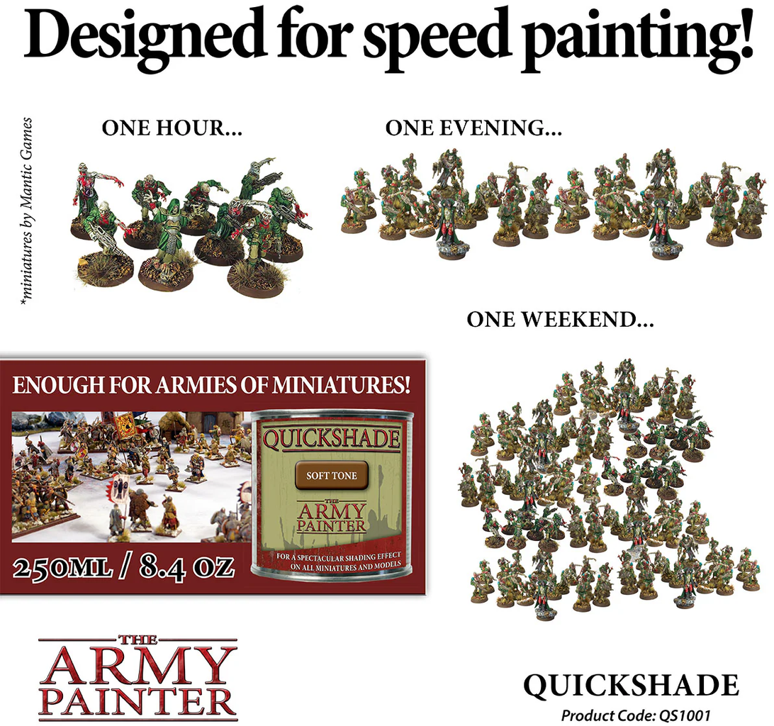 Z Quickshade Dip znamke The Army Painter lahko svoje miniature v hipu pošljete v kraljestvo senc in jih pripeljete nazaj z več podrobnostmi in dinamiko! Ta revolucionarni potopni lak ustvari realistične odtenke, ki vašim modelom dodajo globino in značaj – vse brez ur nanosa plasti. Preprosto potopite, odcedite in profesionalni zaključek je pripravljen!