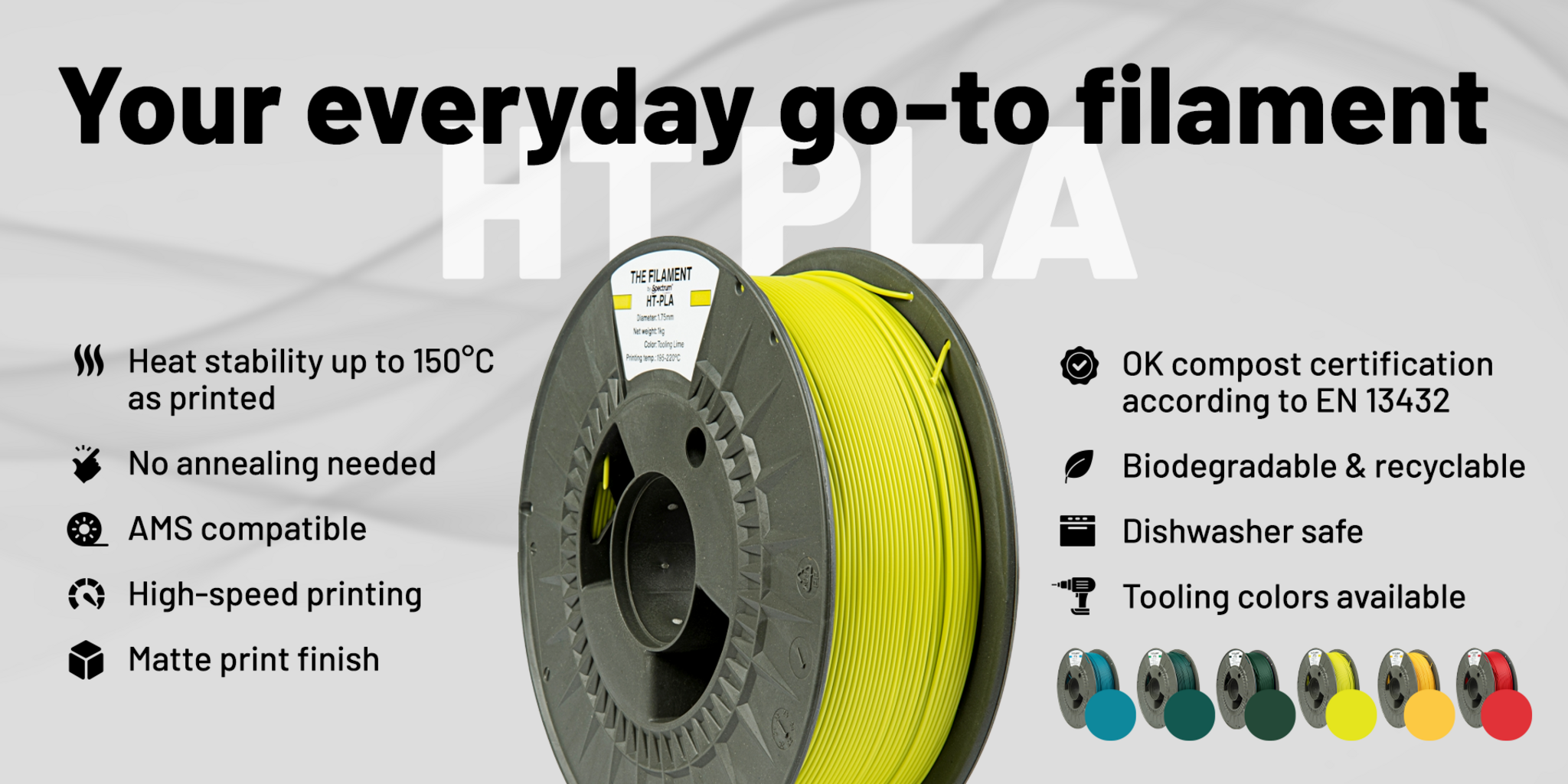 HT-PLA znamke The Filament je visokozmogljiv filament PLA naslednje generacije z impresivno toplotno odpornostjo do 150 °C - brez kakršnega koli žarjenja ali naknadnega sušenja. Vaš predmet je pripravljen za uporabo takoj po tiskanju in ostane dimenzijsko stabilen tudi pri visokih toplotnih in mehanskih obremenitvah.